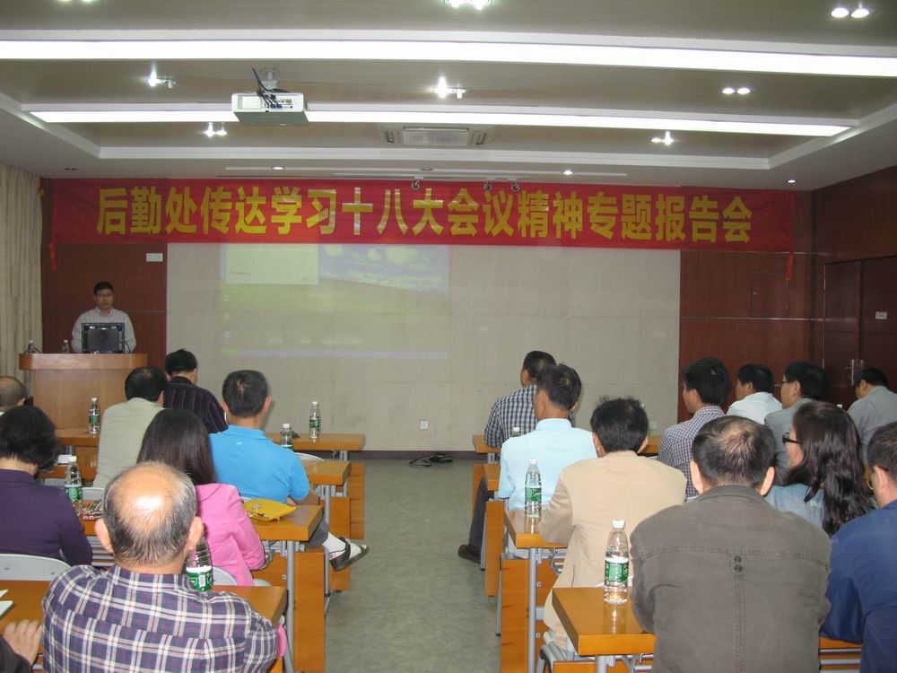 为了深入理解、贯彻十八大精神,11月21日,后勤处、后勤党总支部在六教106课室召开了学习十八大精神专题报告会。学校党委委员、党委宣传部部长胡文涛应邀作专题报告。后勤处处长杨思、党总支书记孙建军等班子领导、总支委员、各支部书记、机关全体干部、实体正副经理、物业管理公司负责人和全体党员共计60多人参加会议。后勤党总支部书记孙建军主持会议。