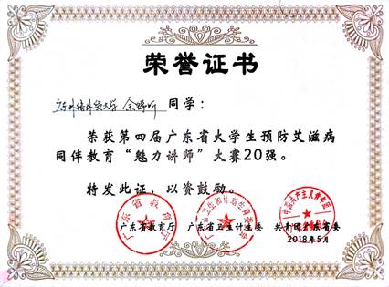 为全面贯彻党的十九大精神,落实省委、省政府关于实施“健康广东”的工作部署,动员和号召更多的大学生关注性与生殖健康问题,参与学校性与生殖健康、预防艾滋病的健康教育活动,提升青年学生性与生殖健康、预防艾滋病的素养和能力。我校红十字会学生分会选送刘晓丽、余锦昕、郑涛三位同学参加省教育厅、省卫生计生委和团省委在2018年5月联合举办了第四届广东省大学生预防艾滋病同伴教育“魅力讲师”比赛。经过激烈的初赛、复赛和决赛,余锦昕同学荣获第四届广东省大学生预防艾滋病同伴教育“魅力讲师”大赛20强。