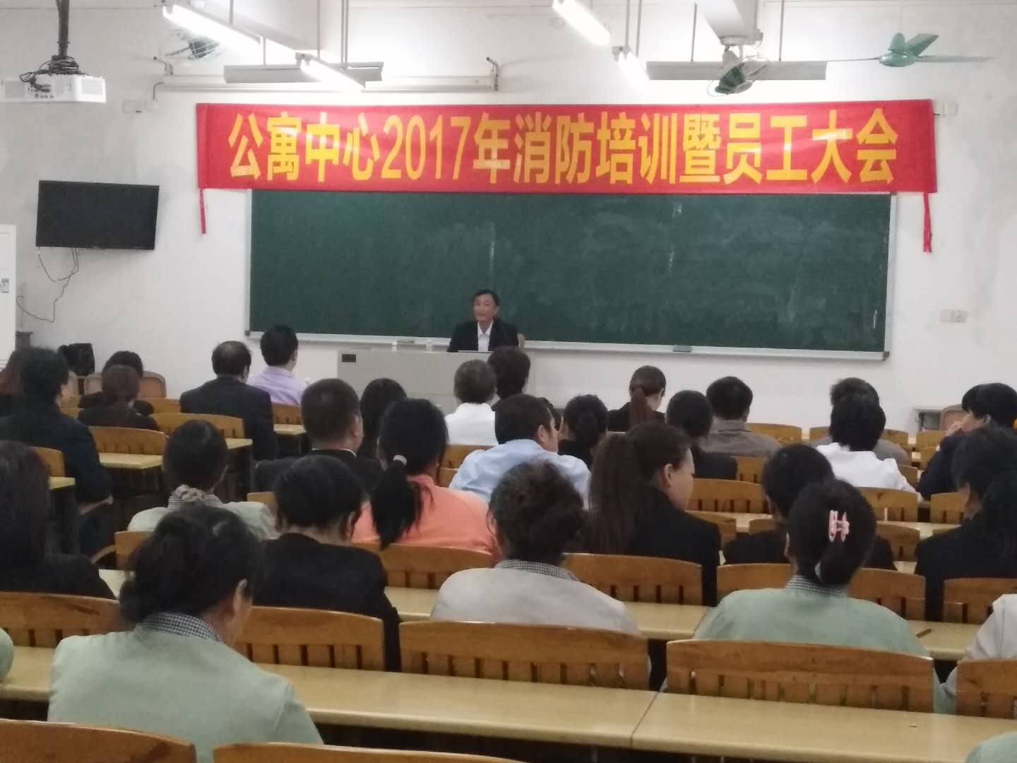 讲课围绕:预防为主,防消结合;初起火灾的扑救方法;扑救火灾的一般原则;灭火器的种类、性能;灭火器和消防水管的使用方法等。