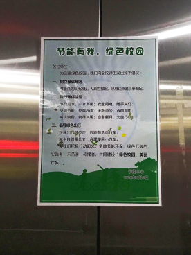 为在校内营造绿色环保氛围,配合即将到来的全国节能宣传月活动,节能中心设计制作了节能倡议海报,并于5月中旬在校内电梯进行了张贴。